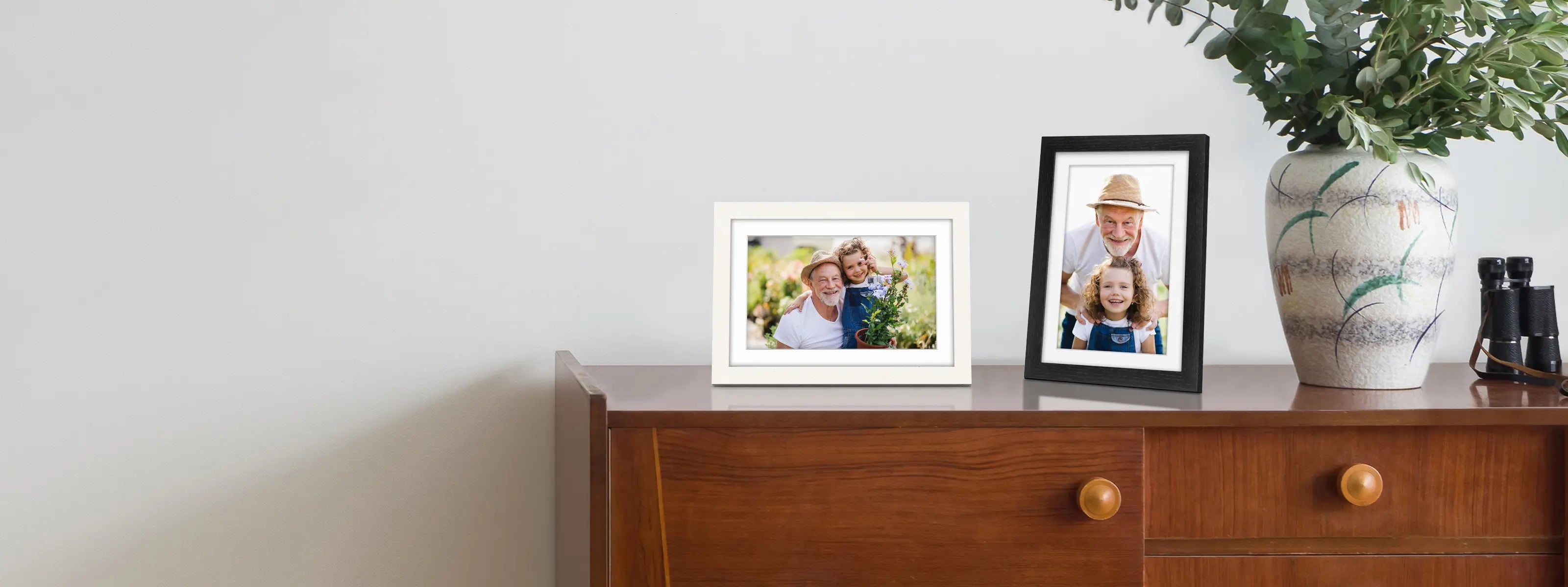 A wood-framed digital display showcased rotating photos in a subtle, homey style. Once set up on a shelf, it scrolled through older favorites and fresh snaps sent via an app.