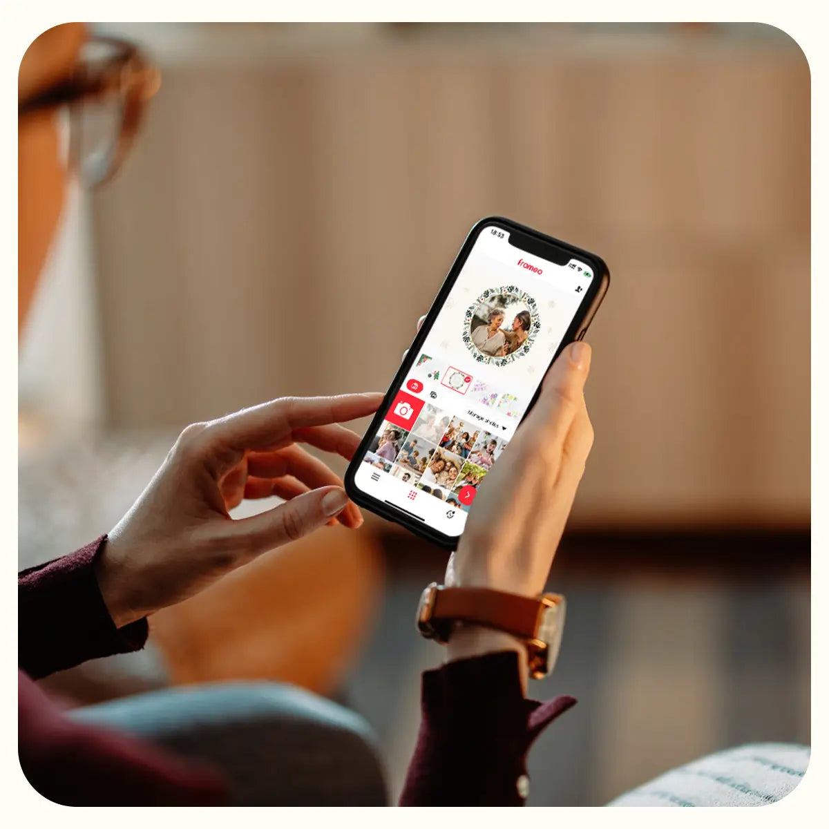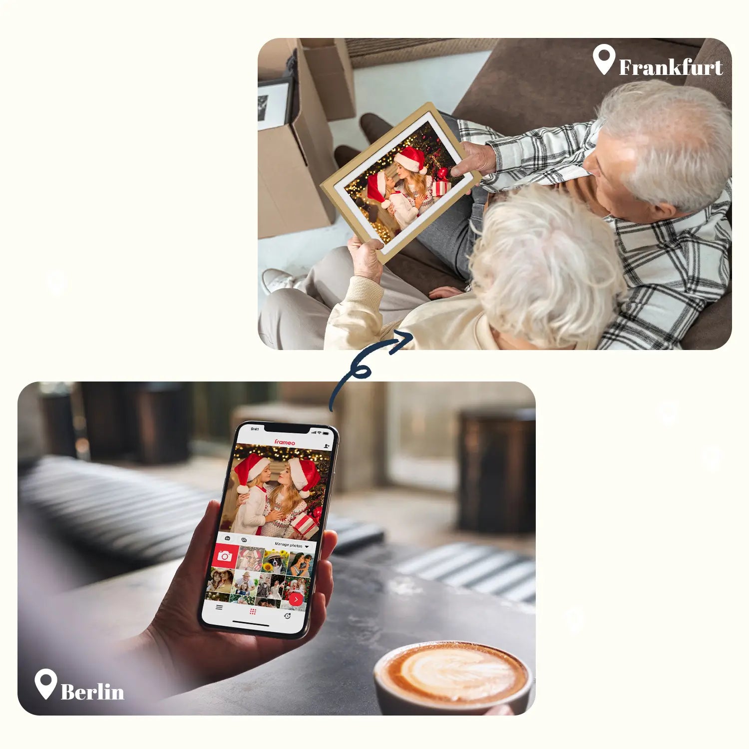 Egal wo Sie sind, lassen Sie Ihre Familie an Ihren Erlebnissen teilhaben. Mit der kostenlosen Frameo-App senden Sie Fotos, kurze Videos und persönliche Nachrichten in Sekundenschnelle direkt an den Frame Ihrer Lieben. So einfach können Sie Ihren Alltag teilen und sich trotz Entfernung verbunden fühlen.