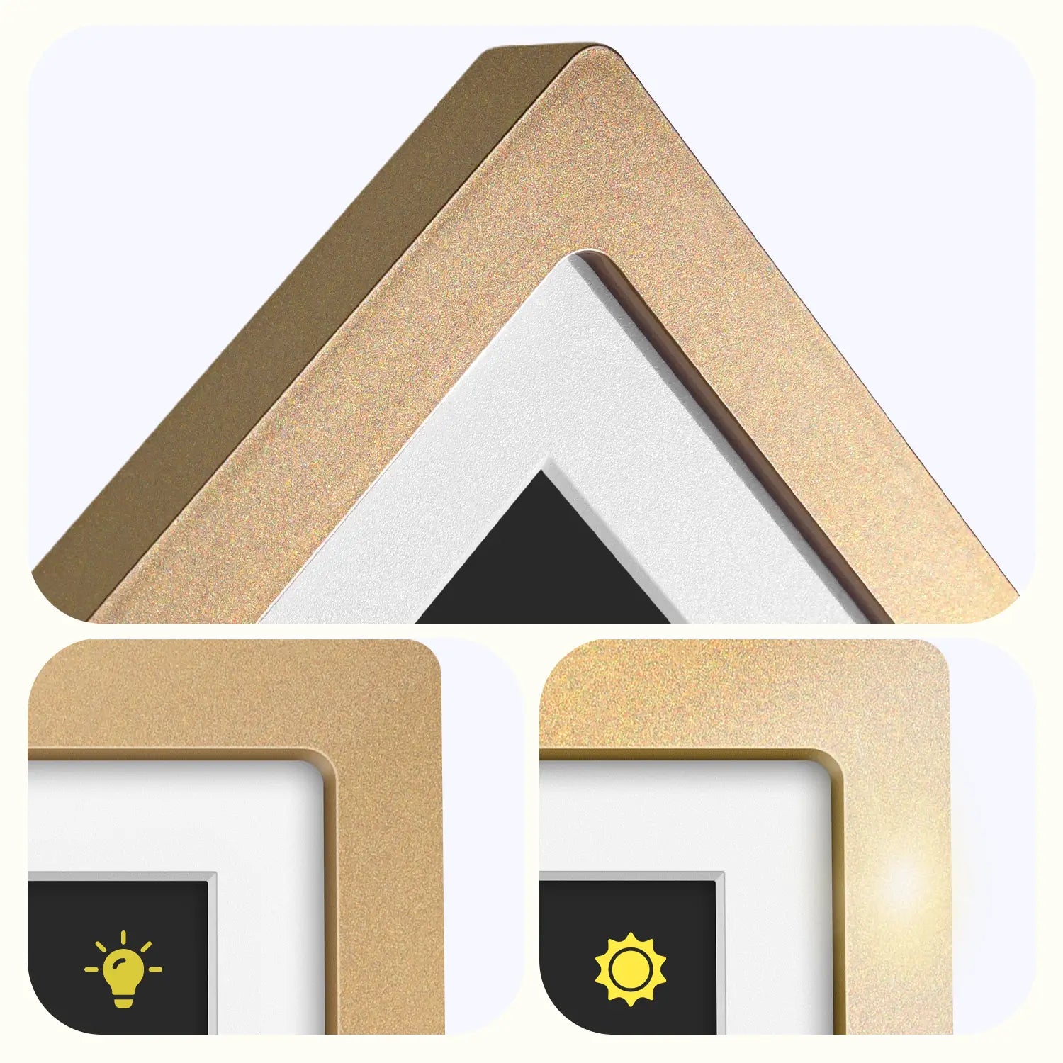 Erleben Sie Eleganz neu definiert. Anders als grelle, glänzende Metalle bietet unsere charakteristische Sunset Gold-Oberfläche einen sanften, edlen Glanz. Sie verwandelt sich von einem warmen, matten Goldton im Innenbereich in einen subtilen, schimmernden Sandton im Sonnenlicht. Die UV-beschichtete Oberfläche ist resistent gegen Fingerabdrücke und Kratzer und garantiert so dauerhafte Schönheit.