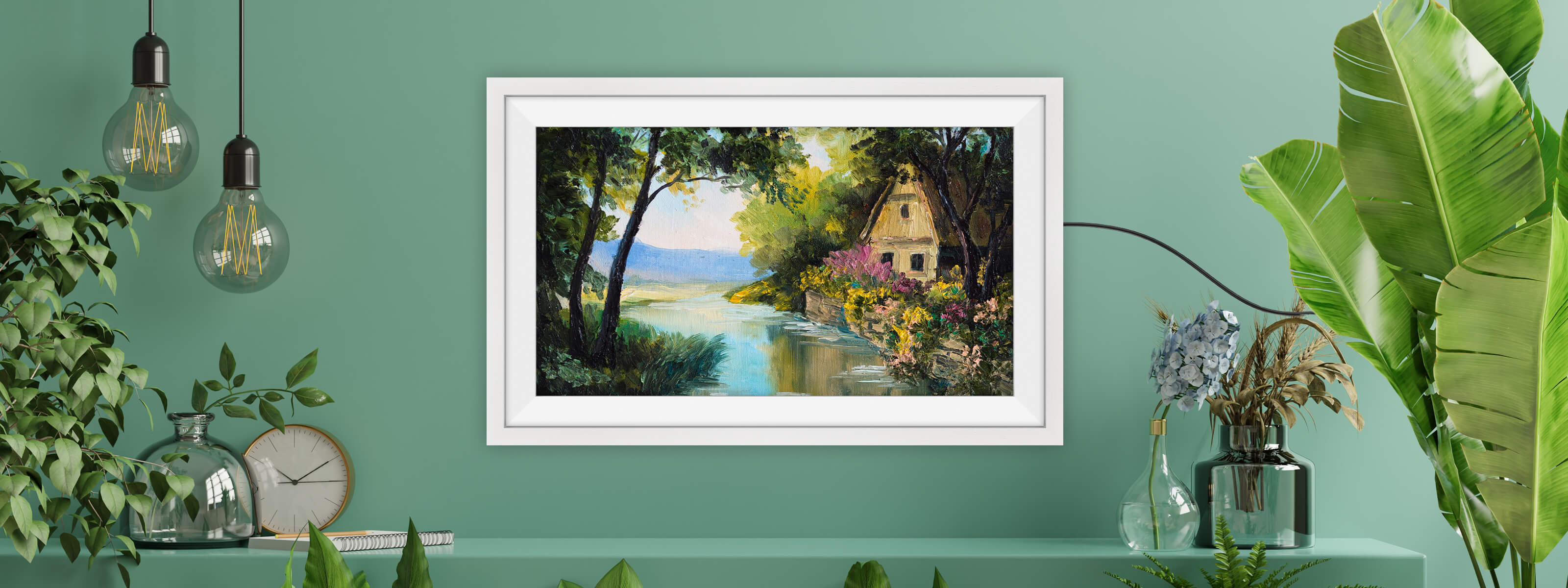 Timeless design with hand-polished wood grain & white mat for a premium home display.